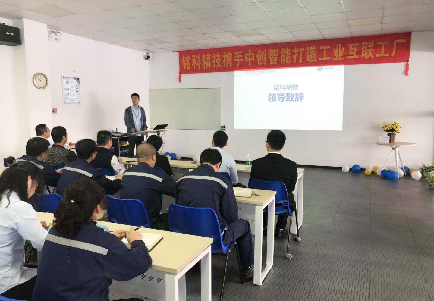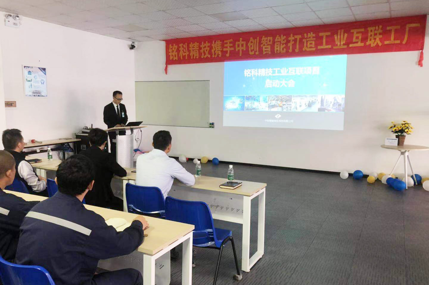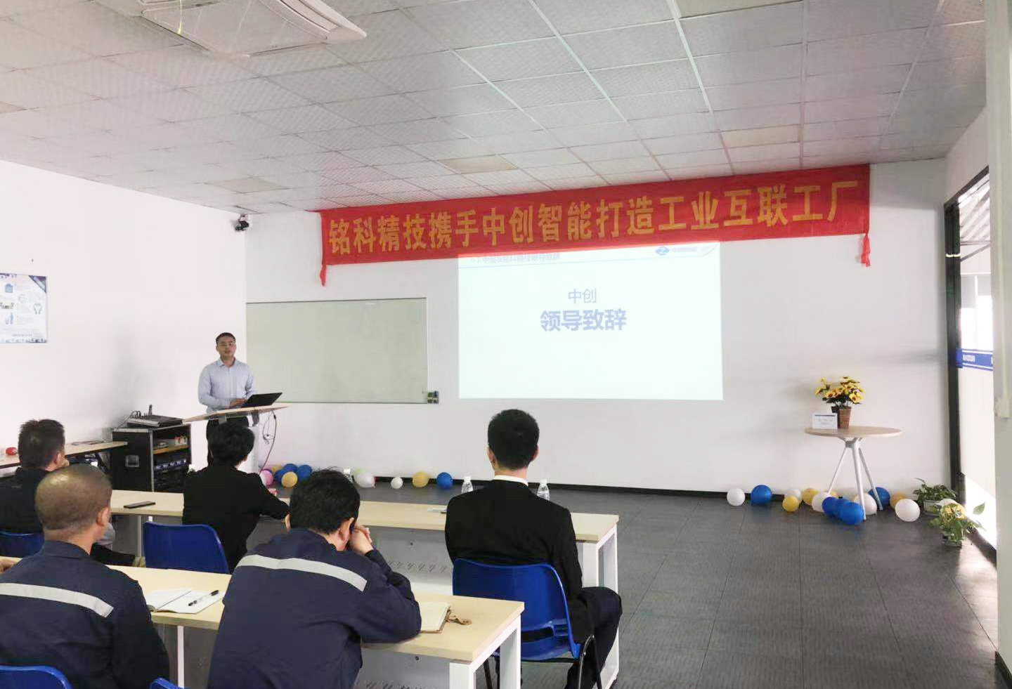 2019年3月4日上午,东莞中创智能制造系统有限公司与东莞市铭科精技五金制品有限公司双方项目组代表,在东莞塘厦铭科精技厂区召开【铭科精技工业互联项目启动大会】,中创智能将为铭科精技提供行业领先的以MES为核心的数字工厂解决方案。结合铭科精技东莞、武汉、重庆三个厂区的生产实际需求,项目将分三期实施,其中一期为建设工业互联系统,将三个厂区设备全部联网,采集生产相关数据,实现设备可视化透明化管理。