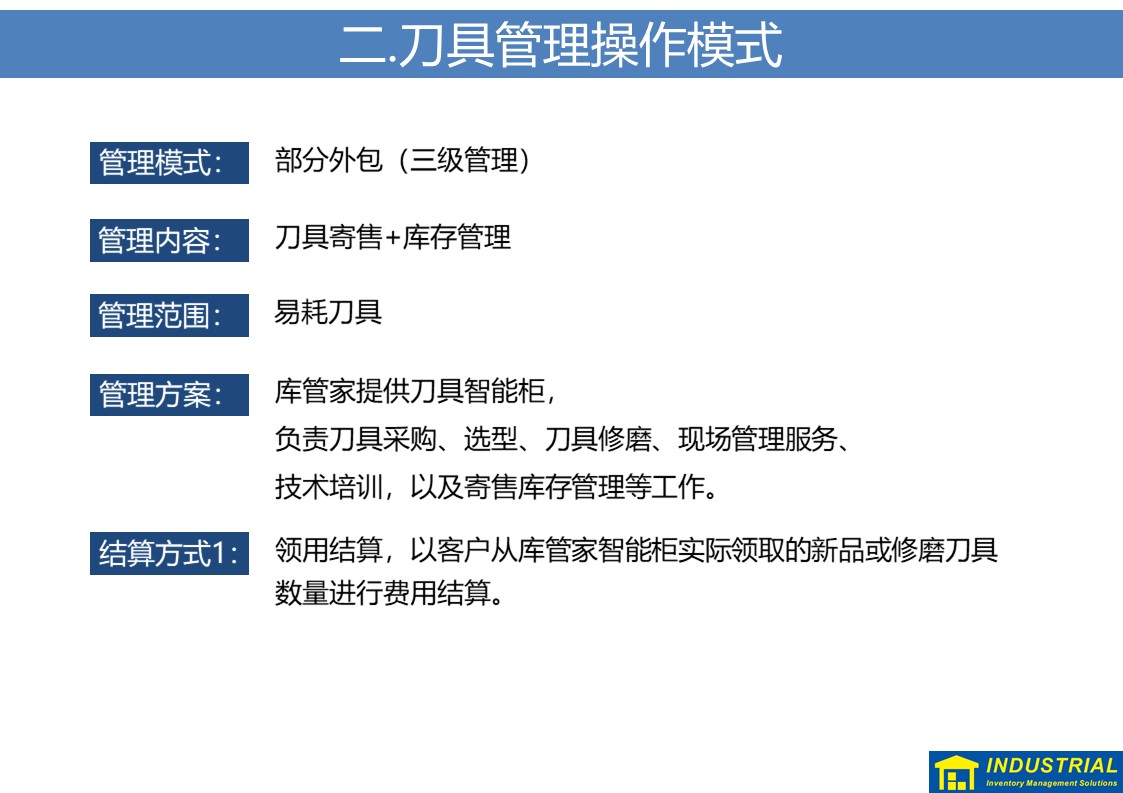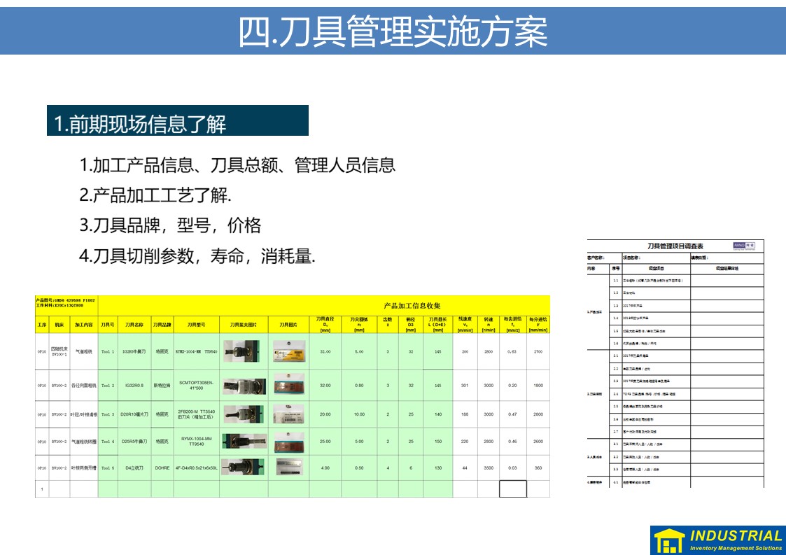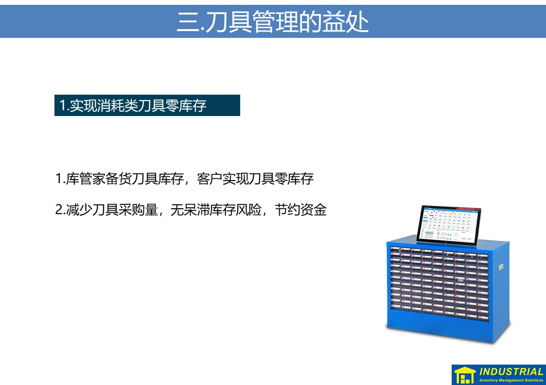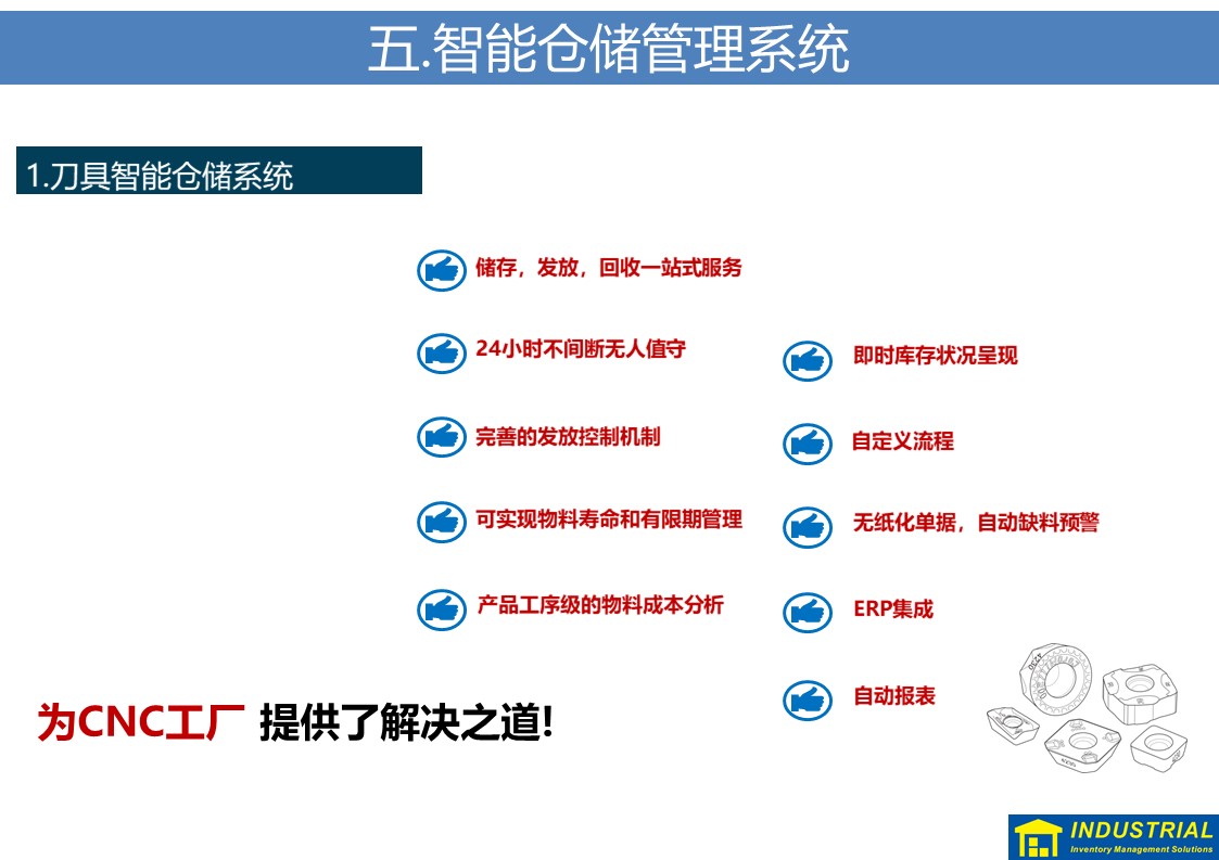 规范解决刀具现场领用、归还,夜班无人值守等问题,实现刀具“无人线边仓”,与企业ERP或MES数据对接,实现了刀具全流程管理的解决方案。