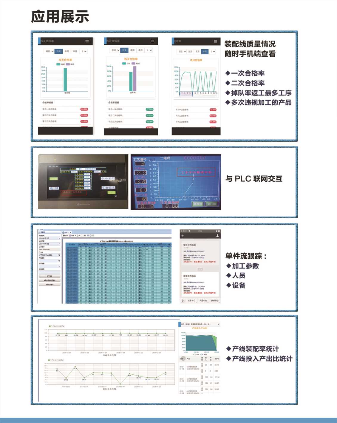 该解决方案应用对象为多工序全自动&人机协同&纯人工装配线,通过追溯、校验、工序控制三大工具,实现装配线的智能化延伸,达到产线加工能力监控和提升的目的。