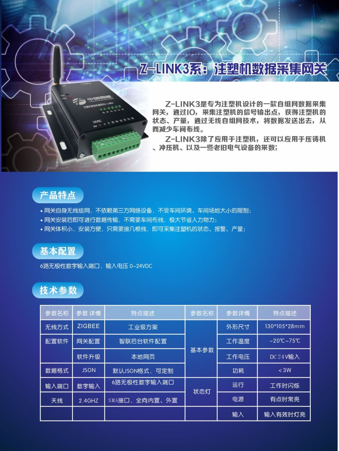 Z-LINK3是专为注塑机设计的一款自组网数据采集网关,通过IO,采集注塑机的信号输出点,获得注塑机的状态、产量,通过无线自组网技术,将数据发送出去,从而减少车间布线; Z-LINK3除了应用于注塑机,还可以应用于压铸机、冲压机、以及一些老旧电气设备的采数。