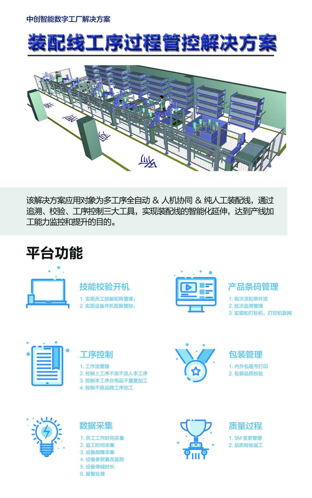 该解决方案应用对象为多工序全自动&人机协同&纯人工装配线,通过追溯、校验、工序控制三大工具,实现装配线的智能化延伸,达到产线加工能力监控和提升的目的。